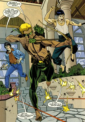 Arsenal, Black Canary, Thorn, Bruce Lee, Elvis) and/or a fight (often guns vs. arrows).