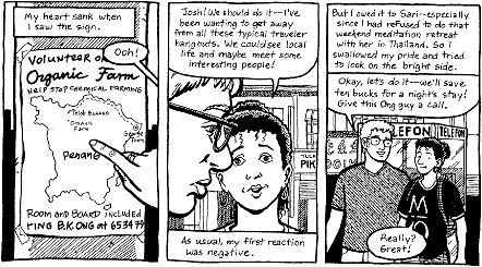 Keyhole is a two-person anthology by Dean Haspiel and Josh Neufeld. For the most part, each works on their own stories (with input from other collaborators); occasionally they do a piece together. The items range from one-shot one-page vignettes, to the recurring adventures of an off-beat action hero, to the serialised (apparently autobiographical) story of a couple's travels overseas. Having done some travelling abroad myself (and doing it on the cheap and trying to get "off the beaten track", as they did), I found the "Josh and Sari" travel pieces very entertaining. Anyone who has ever been in an unfamiliar country wondering what possessed them to embark on such an "adventure" should be able to relate to them. If you haven't... well, enjoy the vicarious "thrills". {grin}