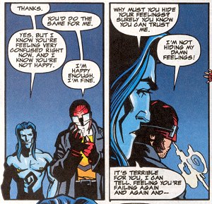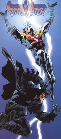 The characters' sexual orientation has never been a focus of any storylines or subplots, and in fact has never been explicitly stated. But during the time they've been around, they've consistently been portrayed as very close, and when one was seriously injured in a fight, the other was shown cradling him with a kind of intimacy and speaking with a level of protectiveness that seemed to go beyond mere friendship. In response to reader questions, the characters' creator Warren Ellis has said, "Yes, Apollo and Midnighter are, in the debased English parlance, up each other. So what?" (Though he later recanted the implication that it didn't matter, acknowledging the reasons that are quite obvious to anyone reading this page.) | ||