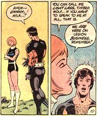 It should also be noticed that Shrinking Violet spent relatively little time with her boyfriend when they were dating (they were on separate teams). Some readers now see him as a "beard" (that is, a disguise to hide one's homosexuality), though he surely wasn't intended as such when the stories were originally written in the late 1970s/early 1980s. Also, at the same time the Ayla/Vi relationship was being shown, the Legionnaires were cloned/duplicated, so that, in addition to the 30-something Legion, there was a teenaged Legion running around. The teenaged clone/duplicate of Vi was shown to be confused because she was feeling attracted to Saturn Girl.