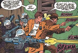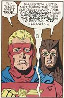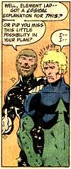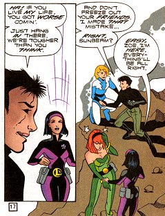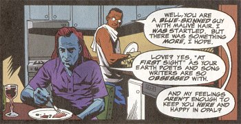 Meanwhile, Frostbite (a man with ice powers, eventually explained to be a snow elf) was involved in a literally-steamy relationship with Bonfire (a woman with fire powers). Eventually this relationship was going to cool off, as Bonfire figured out that she was in love with another team member. But when the series was cancelled, the writer hastily ended it so that he and George could get together before the end. George was reluctant to admit his attraction to Frostbite, who "brought him out", eventually admitted it, and in the last regular issue, as the other team members all paired up, the two of them sat together, implying that this was the beginning of a relationship between them. The following month, in a #1,000,000 issue set a few hundred millenia in the future, Off-Ramp (travelling through time) ran into Frostbite (still alive). There was no specific reference to the nature of their past relationship, but it was clearly a close and affectionate one. | |||