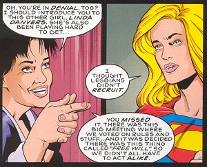 | Rainmaker of Gen13 is a lipstick lesbian, used mostly by writer Brandon Choi for cheap het-boy titillation. The biggest example of it was having Sarah stare at Fairchild's ass while giving Roxy a back rub. As a character, she competent if a bit aloof. She isn't the most warm and cuddly person, but is still loyal and good. You know the drill. How it's handled depends on the writer, and nearly every guest writer (Hughes, PAD, etc.) makes some reference to it. | |||