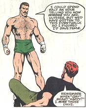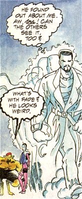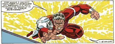 | Spectral, a member of The Strangers was gay. They were a group of ordinary San Franciscans who gained powers when something happened to them on a cable car. Writer Steve Englehart played it coy about Spectral at first, but it came out (so to speak). One of the other characters just asked Dave point blank if he was gay, and thereafter it was just an accepted thing. The way his powers worked was that he glowed in different colors (yes, like a rainbow) each of which produced different powers: fire, air, strength, plant growth (?), etc. In a later issue, Spectral came out to an Army General (this was during the "Don't ask, Don't tell..." hullaballoo), for no apparent reason, except to make a statement. | |||