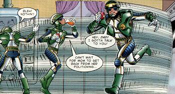 The Legion was started over from scratch in 1994, and none of the new versions of these characters (nor any of their colleagues) has given any clear indication of homosexuality. The writers of the series (and its joined-at-the-hip sibling Legionnaires) stated that at least one member of the team was gay... they just haven't confirmed this yet by showing us. There was a possible hint in one issue: Due to some mucking about with reality, the old adult versions of Ayla and Vi (and other Legionnaires) appear, and there's a panel (see the Shortly after this creative team was replaced, one of them revealed that Invisible Kid Lyle Norg (also on several "short list"s) was the character they had in mind, but he didn't know if the new creative team would follow through on this. | |||
